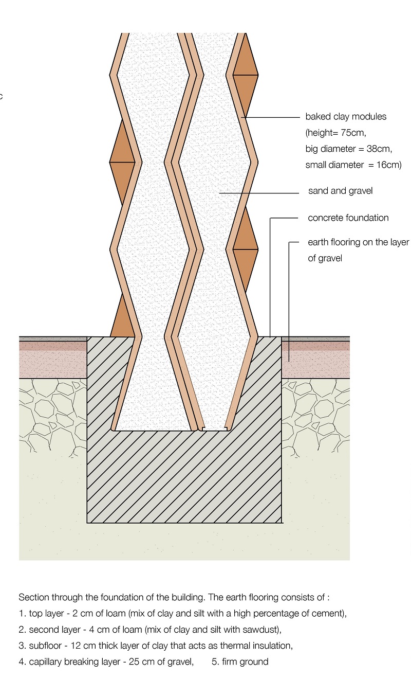 I could see variations having small gaps between the pots to allow great cross ventilation. Alternatively in temperate climates, pots could be filled with water (the highest rated thermal mass) on the equator /sun side and an insulative material like rice husks on the other side. Obviously there would be many technical issues to be solved, but is a creative form of earth building using local materials and trades.